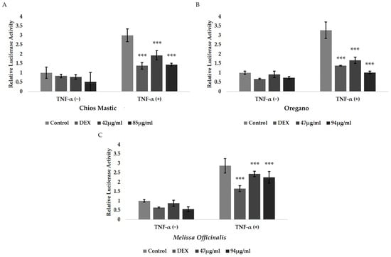 Anti-inflammatory activities of the essential oils from the Chios Mastic, Oregano and Melissa officinalis. Suppression of the TNF-α induced NF-κB transcriptional activation by the essential oils from the (A) Chios Mastic, (B) Oregano and (C) Melissa officinalis. HEK-293 cells were co-transfected with the NF-κB-luciferase reporter and the β-galactosidase reporter constructs and subsequently were treated with the indicated concentrations of the essential oils, or with 1 μM DEX, for 6 h, in the presence or absence of 20 ng/mL TNF-α, at hormone-free medium. Assessment of the luciferase and the β-galactosidase activity was followed. Results were expressed as relative luciferase activity normalized against β-galactosidase activity. Relative luciferase activity in control cells was set as 1. Data were analyzed by two-way ANOVA and are expressed as mean ± SD, (n = 6), *** p < 0.001.