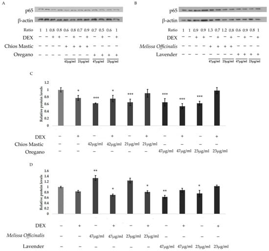 To evaluate whether the EOs-induced suppression of the NF-κB transcriptional activity was associated with the regulation of the protein levels of the p65 subunit of NF-κΒ, Western blot analysis of p65 was performed in protein extracts from HEK-293 cells treated with essential oils at a concentration range indicated in Figure 6, in the absence or presence of DEX for 48 h. As shown in Figure 6, a reduction in p65 protein levels was observed in the essential oils from Mastiha resin, oregano and lavender by 20–40% at a concentration range of approximately 22 to 45 μg/mL. Essential oil from Melissa officinalis showed an increase in p65 protein levels, which is in accordance with its just moderate activity on the suppression of the NF-κB activity.