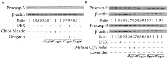 Furthermore, to assess the possible pro-apoptotic activities of the essential oils, Western blot analysis of procaspase-3 and procaspase-9 protein levels was performed in extracts from HEK-293 cells treated with essential oils, at the indicated concentrations (Figure 7), and/or 10 nM DEX for 48 h, in hormone-free medium. As shown in Figure 7B, 47 μg/mL of essential oils from lavender and Melissa officinalis showed a 30% reduction in procaspase-9 protein levels. This effect was also accompanied by a reduction in procaspase-3 protein levels. More specifically, 47 μg/mL of essential oil from lavender caused a 20% reduction in procaspase-3 protein compared to the control. Melissa officinalis essential oil also exhibited 20% to 50% reductions in procaspase-3 protein levels. Essential oils from Chios Mastic and oregano showed no remarkable effects on the procaspase-9 protein levels. In contrast, 42 and 47 μg/mL of the essential oils of Chios Mastic and Oregano caused 20% and 30% reduction in caspase-3 levels, respectively (Figure 7A).