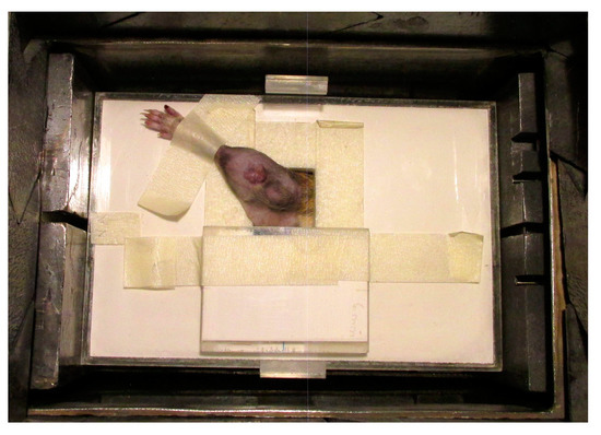 The tumor-bearing legs were treated locally with BNCT at the RA-3 Nuclear Reactor. A lithium carbonate thermal neutron shield (enriched to 95% in lithium-6), designed and fabricated ad hoc, was used to protect the body of the animal from the thermal neutron flux while exposing the leg through a collimated aperture (Figure 2). The thermal neutron fluence at the irradiation position was 4.2 × 1012 n cm−2 for all protocols.