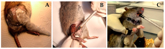 (A) A compress moistened with GLN was placed on the leg treated with BNCT. (B) O-Fuco was applied topically on the leg treated with BNCT. The leg was then loosely wrapped in film (C) Oral administration of O-Fuco by introducing a syringe without a needle on the left side of the mouth of the rats treated by topical administration of O-Fuco.