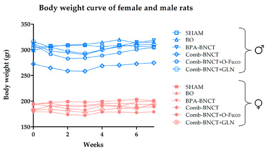 The body weight curve over time (Figure 5) was constructed for males and females since their means are different. No significant differences were observed over time or between groups.