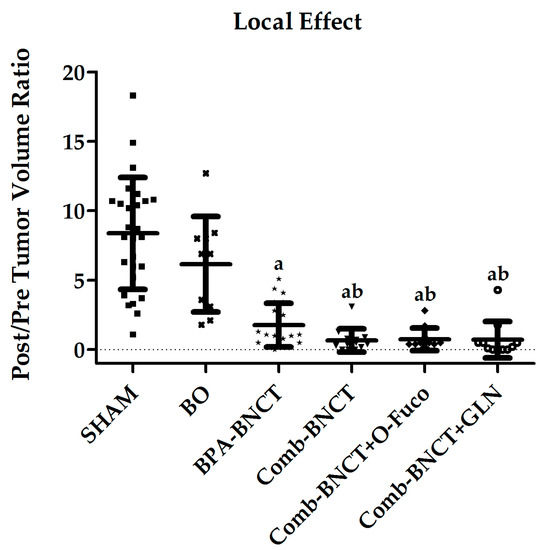 Post/pre-treatment tumor volume ratio (Mean ± SD (N)) vs. experimental group. a = p < 0.05 vs. SHAM, b = p < 0.05 vs. BO.