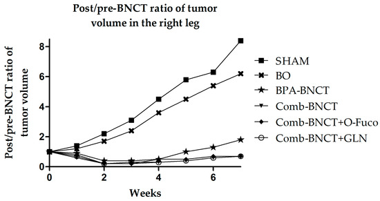 The post-/pre-BNCT ratio of tumor volume at 7 weeks post-treatment in the right irradiated leg (Figure 6) was significantly lower for all the groups treated with BNCT vs. SHAM (p < 0.05).