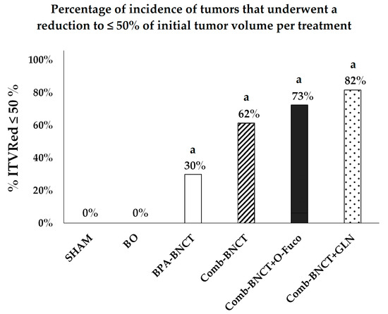 Using the end-point “incidence of tumors that underwent a reduction to ≤50% of initial tumor volume” (ITVRed ≤ 50%) to further assess the therapeutic response, results were 62% for Comb-BNCT alone, 82% for Comb-BNCT+GLN, 73% for Comb-BNCT+O-Fuco and only 30% for BPA-BNCT (Figure 8).