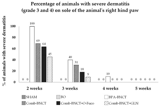 The incidence of severe dermatitis at two weeks (when the peak occurs) was 100% for BPA-BNCT, while for Comb-BNCT, Comb-BNCT+O-Fuco and Comb-BNCT+GLN, it was below 70%, with this difference being statistically significant (p ≤ 0.05) (Figure 9). Although different percentages of radiodermatitis were observed in the different Comb-BNCT groups, these differences did not reach statistical significance. When we evaluated recovery in the third week, we observed that severe dermatitis persisted in half of the animals treated with Comb-BNCT but only in a quarter or less of the animals treated with Comb-BNCT+O-Fuco and Comb-BNCT+GLN. These findings would indicate an improvement in recovery in the groups treated with O-Fuco and GLN as adjuvants. No dermatitis was observed in the SHAM and BO groups.