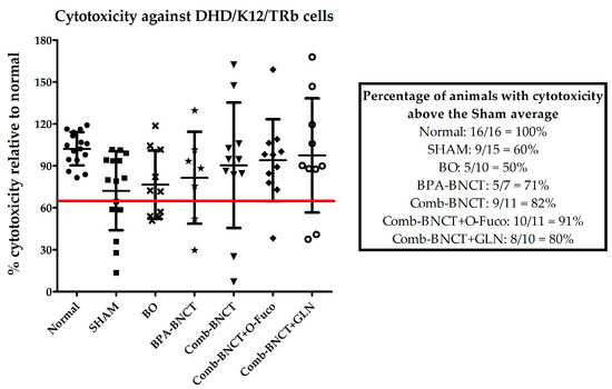 The percentage of animals with cytotoxicity levels that were higher than the mean of the SHAM group (Figure 10) revealed that the immune response was enhanced for Comb-BNCT vs. BPA-BNCT. In addition, O-Fuco seemed to improve the immune response further.