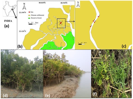 Depicts the quadrat and salinity sampling sites in the central Indian Sundarbans. (a) Map of India with the area of Sundarbans zoomed out. (b) The whole region of Indian Sundarbans depicted along with the reserve forest and human habitable islands, from which the biodiversity sampling locations (1–4) were zoomed out. (c) The biodiversity sampling area zoomed out and depicted as points (1–4). (d) The quadrat sampling at the study site with dominance of Avicennia marina. (e) The sampling site and the adjoining creek in high tide have been depicted in this picture. (f) A natural occurrence of Suaeda maritima in the study site observed near to the LTL.