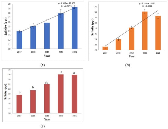 Salinity ranges of surface water analyzed from 2017 to 2021. (a) The post-monsoon salinity range (n = 5) showed a clear trend of salinity rise from 2017 to 2021. The error bar represents ± 1 standard deviation. (b) The pre-monsoon salinity range (n = 5) estimated in ppt showed a clear trend of salinity rise. The error bar represents ± 1 standard error. (c) The annual change in salinity profile was tested through one-way ANOVA, (n = 10); the lowercase alphabetical letters indicate the DMRT post-hoc test.
