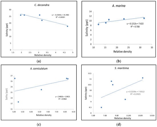 The significant relationship is found between three mangrove species with rising tidal water salinity trends due to the impact of cyclones/storm surges. The figures show that (b) A. marina and (c) A. corniculatum are showing a significant rise in relative density with an increase in average salinity from 2017 to 2021, whereas (a) C. decandra, the true mangrove member of the Rhizophorceae family, show a decreasing relative density with increasing salinity gradient. Mangrove associate (d) S. maritima has been showing an increasing trend in relative density with salinity with weak correlation.