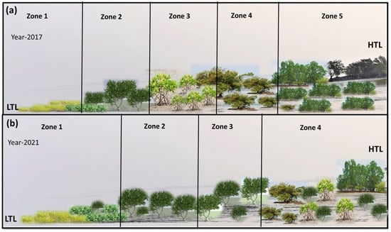 The changes in zonation pattern have been observed in the study site between 2017 and 2021. (a) Before the cyclonic disturbances (2017), the study area was divided into five zones, where Zone 1 has a predominance of Suaeda maritima and Proteresia coactata, followed by Zone 2 with Avcennia marina, Acanthus ilicifolius and Aegiceras corniculatum, followed by Avicennia alba, Avicennia officinalis and Rhizophora mucronata Zone 3. Zone 4 is mostly dominated by Aegialitis rotundifolia and Ceriops decandra, while the last zone (Zone 5) has tree species such as Sonneretia caseolaris, Xylocarpus granatum, Xylocarpus moluccensis and Excoecaria agallocha. (b) Phytosociological assessment of the study area after consecutive cyclone instances and a rise in salinity (2021) indicated a shift in the community composition in the zones. Zone 1 is again predominated by Suaeda maritima and Proteresia coactata followed by Avicennia marina and Acanthus ilicifolius in Zone 2. Zone 3 has an association of Avicennia marina and Aegiceras corniculatum followed by Avicennia officinalis and Avicennia alba, while Zone 5 was not found to be distinctly identifiable. Hence, it is seen that mangrove zonations in response to tidal amplitude (from LTL to HTL) are becoming homogeneous with a dominance of A. marina in most of the associations.