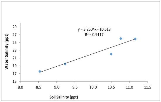 The relationship between average annual tidal water salinity and annual soil salinity between 2017 and 2021. For easy comparison, both the salinity units were taken as parts per thousand (ppt).