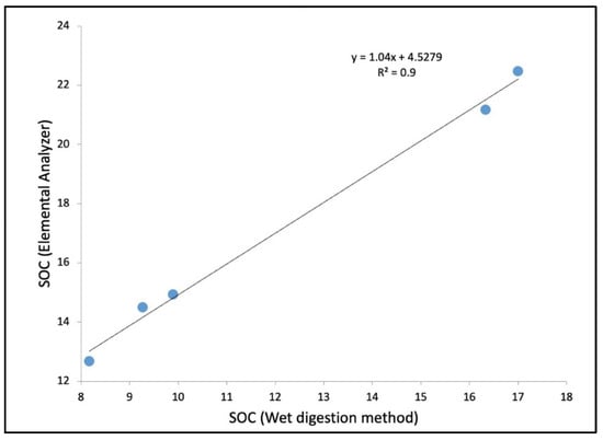 SOCW is prone to interferences due to manual error, while titration or changing strength of K2Cr2O7 during analysis can influence the outcome. An elemental analyzer has been widely used in the carbon estimation of coastal saline or hypersaline soil [25,26,27]. Although a positive relationship was observed between the concentration of SOCW and SOCEA with a ‘R2’ value of 0.9 (Figure 7), a lower SOCW value has been observed in comparison with the SOCEA value, which may be due to interferences or manual errors while conducting the wet digestion analysis. As evident from work of Passos et al. and Nóbrega et al., C estimation with an elemental analyzer has better accuracy in case of coastal and mangrove soil [26,27].