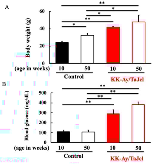 The body weight was higher in KK-Ay/Tajcl mice than in the controls. The body weight of the control mice increased with age, but that of the KK-Ay/Tajcl mice did not differ between 10 and 50 weeks of age (Figure 1A). The blood glucose levels were higher in the KK-Ay/Tajcl mice than in the control mice. In the control and KK-Ay/Tajcl mice, the blood glucose levels did not change with age; however, in the KK-Ay/Tajcl mice, the 50-week-old mice showed higher blood glucose levels than the 10-week-old mice (Figure 1B).