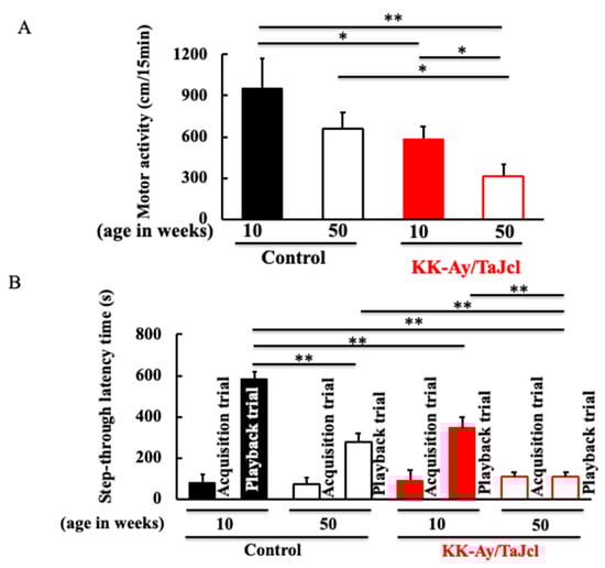 Effect of aging on motor activity (A) and memory and learning activity (B) in KK-Ay/TaJcl mice. The step-through passive avoidance test (B) was used to assess memory and learning abilities. Values are expressed as the mean ± the SD of five animals. * p < 0.05, ** p < 0.01. Control: C57BL/6j mice.