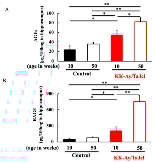 AGEs are produced in large quantities in patients with diabetes. We investigated the expression levels of AGEs and their receptor, RAGE, which are involved in memory and learning, in the hippocampus. Both the AGE and RAGE levels were higher in the KK-Ay/Tajcl mice than in the controls (Figure 3A,B). In addition, in the KK-Ay/Tajcl mice, it significantly increased at 50 weeks of age compared to that at 10 weeks of age (Figure 3A,B).