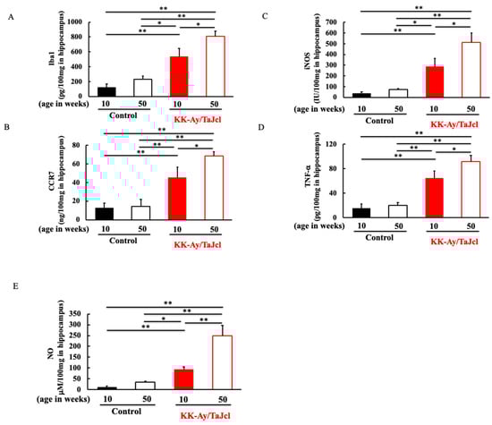 Effect of aging on the levels of Iba1 (A), CCR7 (B), iNOS (C), TNF-α (D), and NO (E) in the hippocampus of the KK-Ay/TaJcl mice. The data show one representative experiment containing five animals. The hippocampus levels of Iba1, CCR7, iNOS, and TNF-α in the mice were measured using an ELISA kit. The hippocampus level of NO was measured using the assay kit. Values are expressed as the mean ± the SD derived from five animals. * p < 0.05, ** p < 0.01. Control: C57BL/6j mice.