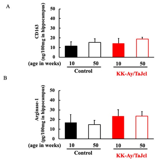 Effect of aging on levels of CD163 (A) and arginase-1 (B) in hippocampus of KK-Ay/TaJcl mice. The data show one representative experiment containing five animals. The hippocampus levels of CD163 and arginase-1 in the mice were measured using an ELISA kit. Values are expressed as the mean ± the SD derived from five animals. Control: C57BL/6j mice.