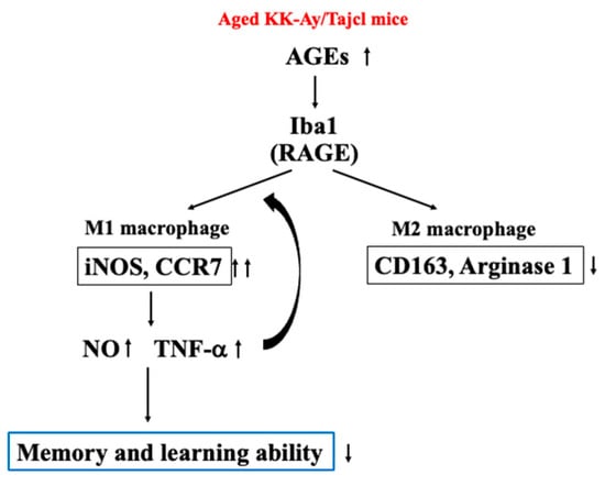 Thus, in aged diabetic mice, brain hippocampal AGEs activate microglia and shift to type 1 macrophages through the action of cathepsins and TNF-α. It has been suggested that M1-type macrophages secrete large amounts of inflammatory cytokines and NO, which cause neuropathy (Figure 6).