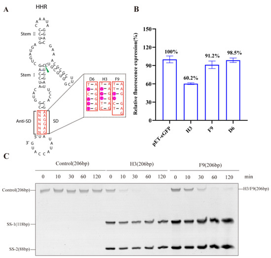 However, the tightly blocked SD design showed weak eGFP fluorescence recovery performance under the IPTG-induced condition, which was inconsistent with the results reported in the literature [32]. We found that the design with −30.50 kcal/mol minimal free energy led to rigid construction, which made its effective release difficult. Therefore, we modified the structure by randomizing the 6nt anti-SD RNA sequence to perform an in vivo screening of E. coli. Three candidates were obtained for their best fluorescence intensity recovery performance (Figure 1A,B). Both F9 and D6 candidates restored eGFP expression to the level of positive control to a high degree. Since D6, with 4nt non-complementary sequence to the SD, showed a high initial fluorescence level even without IPTG, H3 and F9 were utilized for the primary verification of HHR construction in the subsequent experiments.