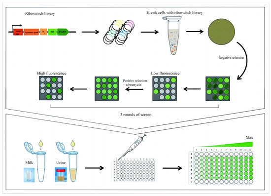 Schematic diagram of the screening of ribozyme-based tobramycin-responsive whole-cell micro-biosensor.