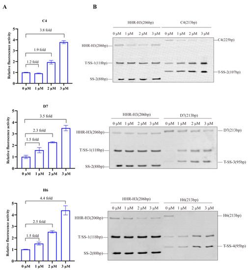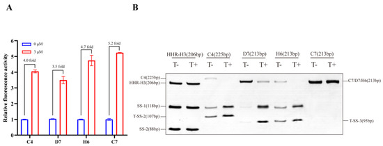 Screening of tobramycin dose-dependent sensor: (A) tob-HHAz C4, D7, H6, and C7 were available and exhibited a significant positive fluorescence response to tob. Fluorescence intensity of C4, D7, H6, and C7 in the presence (blue) and absence (red) of 3 μM tob was detected using a microplate reader. Each measurement was repeated in triplicate, and values of relative fluorescent expression were normalized with 0 μM of tobramycin; (B) denatured urea–PAGE assay of tob-HHAz self-cleavage reaction in vitro. Cleavage of ribozymes was induced with or without 3 μM tob. The HHR-H3 sample clone lacking the tob aptamer was used as a negative control.