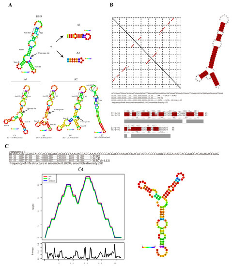 In addition, the RNAfold software was used for further analysis of the folding dynamics of the core structure of the tob-HHRAz RNA. Figure 7C shows the mountain plot of the minimum free energy structure, centroid structure, and partition function structure of the C4 sequence. The close correlation of these curves indicates the fact that C4 with the lowest MFE value had the most stable and conservative construction, compared with D7 or H6. This result is in agreement with the results of the previous experiments.