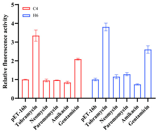 Under 3 µM concentrations, the performance of C4 and H6 sensors was not affected by neomycin, paramycin, and amikacin, showing excellent tobramycin specificity. It is worth noting that both sensors exhibited a 2–3-fold improvement in the relative fluorescence intensity by adding 3 µM of gentamicin (Figure 8). The outcome of the cell vitality test suggests that a higher level of gentamicin has a serious impact on bacterial multiplication (Figure S2D), resulting in a large deviation in the value of the relative fluorescence intensity. Fortunately, we found that a lower gentamicin concentration (less than 1 µM) (Figure S3), which was far more than the threshold value of detection in most real samples, had little effect on bacterial growth; thus, we hypothesized that it might not influence the specificity of these sensors in the real sample test. The results were confirmed in the subsequent experiment (Figure 9B).