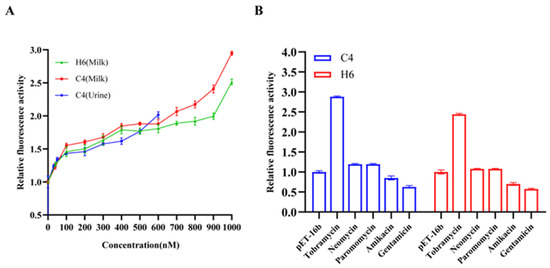 Tobramycin detection in milk and urine: (A) qualitative of tobramycin in milk and human urine. Both C4 (red line) and H6 (green line) exhibited high sensor performance with the detection linear range from 0 to 1000 nM, involving a 40 nM minimum detection limit. C4 (blue line) exhibited a linear range from 30 to 650 nM with a LOD of 30 nM in human urine detection. The error bar graph represents the variation between triplicate experiments; (B) specificity of the sensor fluorescence assay for tob detection; the concentrations of substances were all 1000 nM. The data were normalized using the fluorescence expression of negative control.