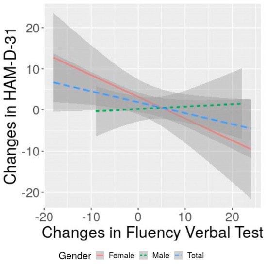 3.4. Correlation of Changes in Severity of Depression with Changes in Cognitive Performance and with Functional Status: Specificities of Women and Men