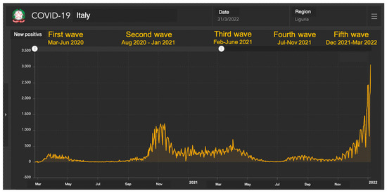 COVID-19 cases in Liguria from March 2020 and March 2022 (data from Department of Protezione Civile). Data from: https://mappe.protezionecivile.gov.it/it/mappe-e-dashboards-emergenze/dashboards-coronavirus/situazione-desktop/ accessed on 9 July 2023.