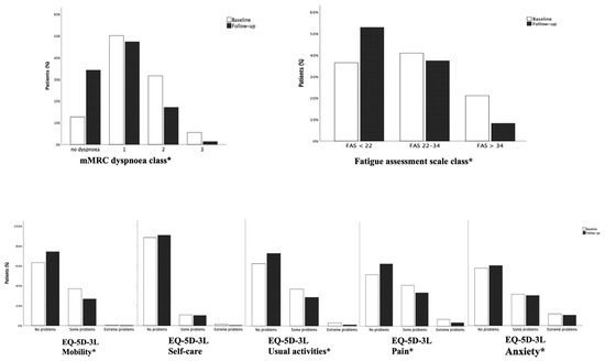 Differences in prevalence of dyspnea, fatigue and problems in quality of life at baseline and follow-up visit. The degree of dyspnoea (4 point scale), the degree of fatigue (3 point scale) and the degree of problems on 5 domains of quality of life (3 point scale) were compared at baseline and follow-up visit in the same subjects. The McNemar Bowker test was used for comparisons. * p < 0.05.