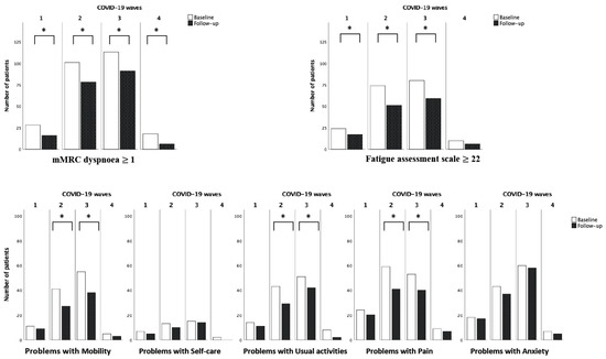 Differences in prevalence of dyspnoea, fatigue ed problems in quality of life at baseline and follow-up visit in the COVID-19 waves. Dyspnoea (Yes vs. No), fatigue (Yes vs. No) and the 5 domains of quality of life (Problems vs. no problems) were compared at baseline and follow-up visit in the same subjects. The McNemar test was used for comparisons. * p < 0.05.