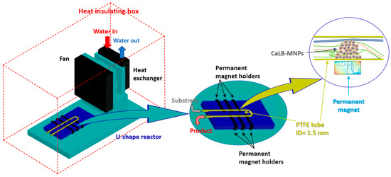 Continuous-flow production is gaining popularity in diverse industries, including in the pharmaceutical sector, with the main benefits of this cutting-edge technology being the capacity to execute chemistry experiments that are challenging to conduct in batch mode, as well as faster and safer reactions that may be more ecologically friendly [39]. Numerous researchers combined the advantages of MNP-immobilized biocatalysts and microreactor technology. In recent studies, a simple but effective and convenient MNP-based PTFE tube microreactor with six adjusting permanent magnets underneath the tube was used for the enantiomer selective acylation of drug-like racemic alcohols such as 4-(morpholin-4-yl)butan-2-ol [8], 4-(3,4-dihydroisoquinolin-2(1H)-yl)butan-2-ol, and 4-(3,4-dihydroquinolin-1(2H)-yl)butan-2-ol [9], catalyzed using a biocatalyst obtained via the covalent immobilization of lipase B from Candida antarctica on magnetic nanoparticles (CaLB-MNPs) in a continuous-flow mode. To broaden the spectrum of substrates evaluated in this system, a U-shape reactor was used, and reactions with selected chiral amines were performed. To enhance the accuracy and controllability of the magnetic U-shape reactor, a heat-insulating box was applied to perform reactions with temperature control (Figure 1).