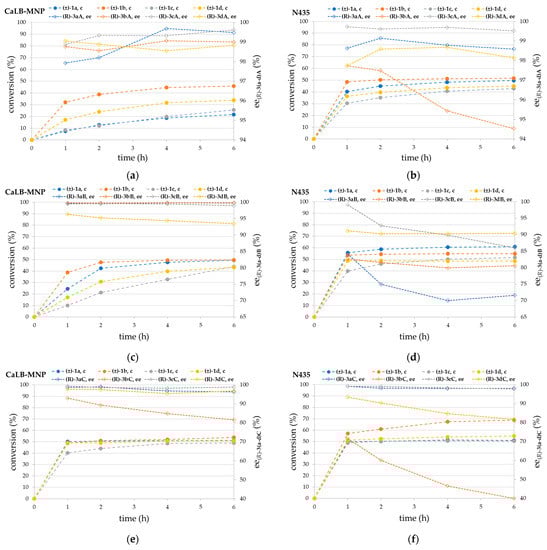 It is clear from Figure 2 that the various starting amines (±)-1a–d were converted in KRs with quite different rates and levels of selectivity. In the CaLB-MNP-catalyzed KRs, the fastest reaction and highest conversion were attained during the N-acylation of the racemic 1-methoxy-2-propanamine (±)-1b, with all acylating agents 2A–C (Figure 2a,c,e). In the CaLB N435-catalyzed KRs, the acylation of racemic 1-methoxy-2-propanamine (±)-1b utilizing diisopropyl malonate 2A (Figure 2b) and isopropyl 2-ethoxyacetate 2C (Figure 2f) were faster. The CaLB-catalyzed acylation of the larger amines (±)-1a,c,d was slower usually but provided proper conversions (≥40%) after 6 h for all cases except when utilizing CaLB-MNPs and 2A as the acylating agent (Figure 2a). The conversions were usually higher in CaLB N435 experiments, often surpassing the 50% theoretical conversion limit for KRs of exclusive enantiomer selectivity.