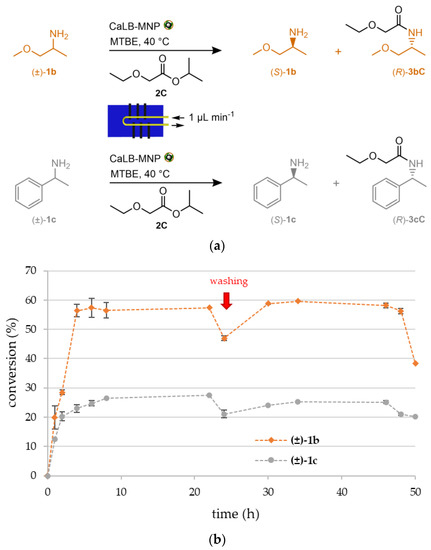 Kinetic resolution (a) of racemic 1-methoxypropan-2-amine (±)-1b and 1-phenylethan-1-amine (±)-1c utilizing isopropyl 2-ethoxyacetate 2C as acylating agent catalyzed using CaLB-MNPs in continuous-flow mode. Time course (b) of the CaLB-MNPs catalyzed KR of (±)-1b,c (100 mM) with 2C in MTBE (in the U-shape reactor (ID = 1.50 mm), MTBE, 40 °C, 1 μL min−1). In both runs, a washing procedure with pure MTBE (60 min at 50 μL min−1 flow) was performed after 24 h, and the reaction was continued.