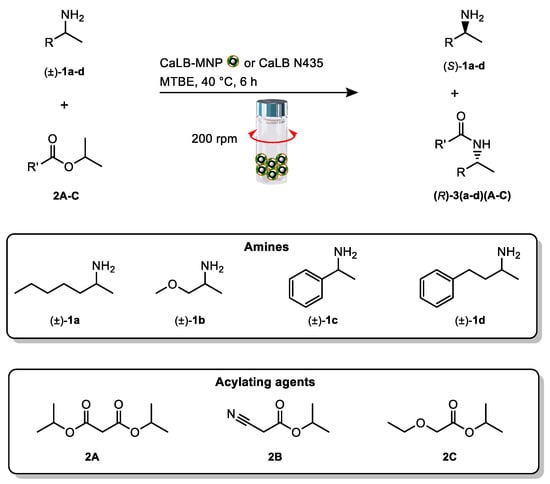 In a 4 mL screw-cap vial, immobilized CaLB enzyme (10.0 mg, CaLB-MNPs or CaLB N435) and methyl tert-butyl ether (MTBE, 200 μL) were added. After sonicating the mixture for 10 min, the corresponding amine ((±)-1a–d, 12.5–100 mM) and the acylating agent (2A–C, 12.5–100 mM, 1 equiv.) were added. The reaction mixture was shaken at the rate of 200 rpm for 6 h at 40 °C and monitored by taking samples after different reaction times (1, 2, 4, and 6 h).
