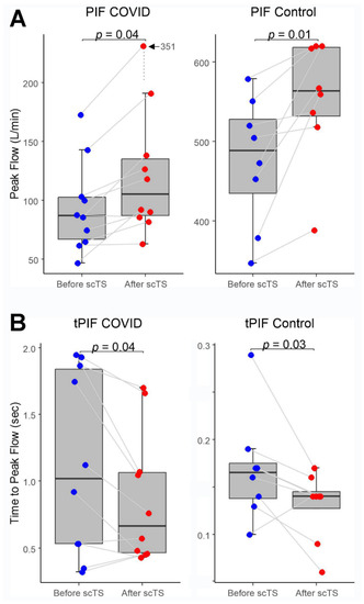 (A) Peak inspiratory flow (PIF) and (B) Time-to-peak inspiratory flow (tPIF) before and after scTS sessions in post-acute COVID-19 individuals (n = 10) and healthy controls (n = 8). Note different scales representing changes in the COVID and control groups.
