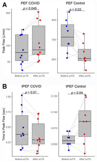 (A) Peak expiratory flow (PEF) and (B) Time-to-peak expiratory flow (tPEF) before and after scTS sessions in post-acute COVID-19 individuals (n = 10) and healthy controls (n = 8). Note different scales representing changes in the COVID and control groups.