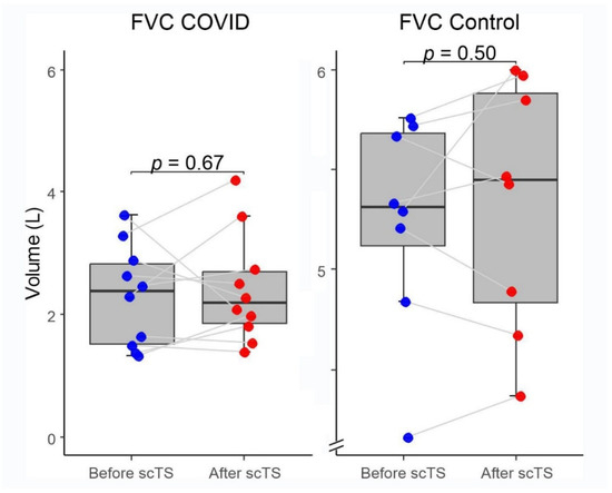 Forced vital capacity (FVC) before and after scTS sessions in post-acute COVID-19 individuals (n = 10) and healthy controls (n = 8). Note different scales representing changes in the COVID and control groups.