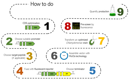 The recently developed online web tool Intronserter (https://bibiserv.cebitec.uni-bielefeld.de/intronserter (accessed on 14 July 2023)) allows the convenient redesign of any target sequence [71] and will help to establish C. reinhardtii as a green cell factory.