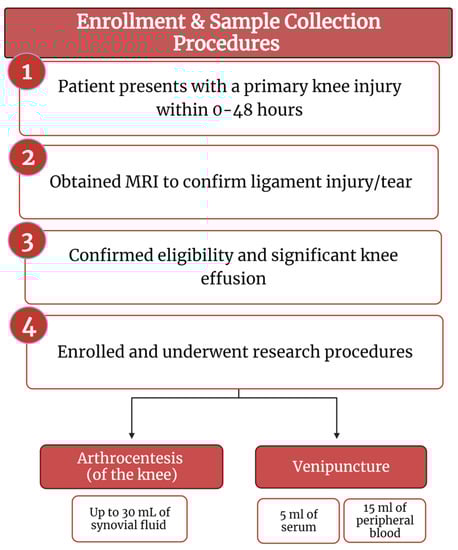 This study was approved by our Institutional Review Board (protocol 2020-49). Patients between 18 and 60 years of age, who presented within 0–48 h of a primary, acute knee injury with significant intraarticular effusion and confirmed ACL tear on magnetic resonance imaging (MRI), were prospectively enrolled in the study between 8 February 2021 and 30 June 2021 (Figure 1). Demographic data, as well as body mass index (BMI), current medications, smoking status, medical comorbidities, and concomitant acute ipsilateral knee pathology on MRI were collected. Exclusion criteria included patients over the age of 60, prior ipsilateral ACL injury or surgical treatment, radiographic OA, previous or current fracture of the ipsilateral knee, intraarticular knee injection within 6 months of injury, history of immune or blood disorders, avascular necrosis, and communicable diseases such as HIV/AIDS or hepatitis C. Informed consent was obtained for study enrollment and prior to any research procedures.