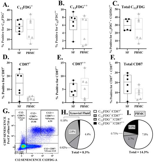Senescent cells were detected in the synovium and peripheral blood of all patients. These included both dim (+) and bright (++) expression for both C12FDG and CD87 (Figure 2). No statistically significant differences were found in the percentage of senescent synovial cells, compared to peripheral blood at a significance of α = 0.05. However, there were near threshold data observed in the comparison of CD87+ PBMCs and synovial fluid samples (Figure 2D, p = 0.0526). The majority of senescent cells detected were double positive for dim C12FDG and dim CD87 in both samples (white, Figure 2H–I).