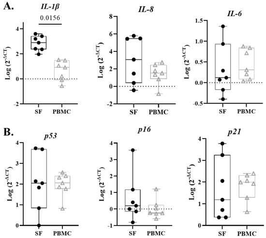 Canonical pro-inflammatory genes (IL-1β, IL-8, IL-6) and the senescence-associated genes (p53, p16, p21) were measured in the cellular component of the synovial fluid and PBMCs. All data were log transformed to achieve normal distribution. IL-1β gene expression in synovial cells was significantly higher than PBMCs (Figure 3A, p = 0.0156). Relative expression of IL-8 and IL-6 was not significantly different in synovial fluid and peripheral blood. Similarly, relative expression of senescence markers p53, p16, and p21 were not significantly different. (Figure 3B).