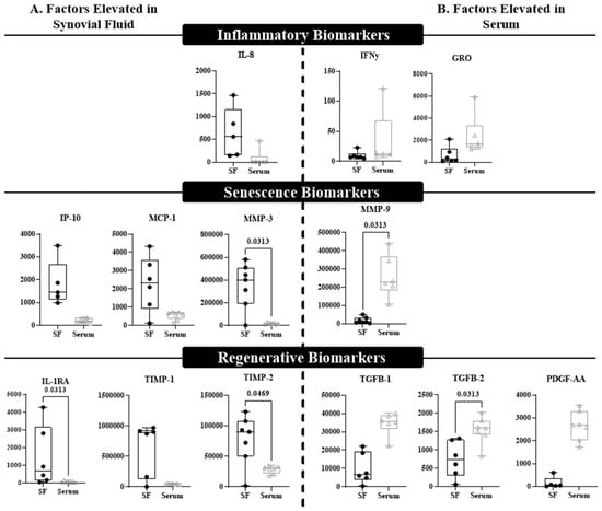 Multiplex immunoassays were also performed to compare the protein levels of senescent, inflammatory, and regenerative factors in the synovial fluid and blood (Figure 4). Only analytes that met 70% detectability were included for analysis, and presented results only include serum compared to synovial fluid, as plasma results were comparable to serum. While some significant differences were observed, there were no clear patterns associated with any of the specific categories. Consistent with gene expression, IL-8 concentrations in synovial fluid trended higher compared to serum and plasma, but there was no significant difference (Figure 4A). Interestingly, inflammatory biomarkers IFNγ and GRO trended higher in serum relative to synovial fluid, but were not statistically elevated (Figure 4B). Mixed results were noted in senescence-associated proteins, with synovial fluid showing significantly higher concentrations of MMP-3 (p = 0.0069) and trending higher in MCP-1 and IP-10. MMP-9 was the only senescence-associated analyte that was higher in serum than synovial fluid (Figure 4A, p = 0.0313). Similarly, consistent trends were not observed for the regenerative factors at the local versus systemic level; pro-regenerative MMP inhibitors TIMP-1 and TIMP-2, as well as the interleukin-1 receptor antagonist IL-1RA, were higher in synovial fluid than serum (Figure 4A, TIMP-1 p = 0.0625; TIMP-2 p = 0.04700; IL-1RA p = 0.0313); however, the angiogenic factor PDGF-AA (p = 0.0625) and growth factors TGFβ-1 (p = 0.0625) and TGFβ-2 (p = 0.0313) were higher in serum compared to synovial fluid (Figure 4B).