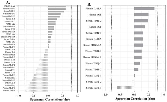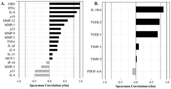 Similarly, in the peripheral blood, strong positive correlations were observed between a variety of senescent and inflammatory biomarkers in acellular serum and plasma with double bright senescent C12FDG++/CD87++ PBMCs, but no significant relationships were found (Figure 6A). Specifically, C12FDG++/CD87+ PBMCs positively correlated with the expression of inflammatory marker IL-1β (ρ = 0.60), plasma MCP-1 (ρ = 0.60), serum MCP-1 (ρ = 0.54), and serum MMP-1 (ρ = 0.43) (Figure 6A, solid bars). There were a variety of strong, but not statistically significant, negative correlations between C12FDG++/CD87++ PBMCs and SASP/inflammatory biomarkers: plasma TNF-α (ρ = −0.80), plasma MMP-3 (ρ = −0.70), plasma IFNγ (ρ = −0.70), serum MMP-12 (ρ = −0.54), serum GRO (ρ = −0.50), and gene expression of inflammatory marker IL-8 (ρ = −0.60) (Figure 6A, striped bars). Additionally, strong correlations were measured between non-senescent C12FDG−/CD87− PBMCs and the regenerative factor IL-1RA (ρ = 0.70) (Figure 6B, solid bars).