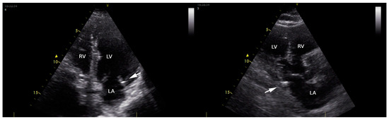 A cardiac structural and functional assessment, including the presence of MAC, was conducted via transthoracic echocardiography using a Vivid T8 Pro, GE Healthcare (according to the newest recommendations of the European Association of Cardiovascular Imaging) [10]. MAC (Figure 1) was defined as an echo-dense structure, located at the junction of the atrioventricular groove and the posterior or anterior mitral leaflet on the parasternal long-axis view; apical 4- or 2-chamber view; and parasternal short-axis view [11]. The parameters quantified during the transthoracic echocardiographic examination were as follows: left ventricular (LV) dimensions (interventricular septum—IVS, left ventricular posterior wall—LVPW, left ventricular end-diastolic diameter—LVEDD); LV systolic function (LV ejection fraction via Simpson method—LVEF), and LV diastolic function (E/A; E/e’; left atrium volume). E/A ratio was assessed in patients in sinus rhythm in apical 4- or 2-chamber view; E represents the maximum velocity of early diastolic filling of the mitral flow, and A represents the maximum velocity of the late diastolic filling of mitral flow. The diastolic index or E/e’ ratio (the ratio of early mitral in-flow to tissue velocity of the mitral annulus) was assessed in apical 4- or 2-chamber view in patients with AF (A wave being absent in these patients). We used the e’ velocity obtained via Tissue Doppler Imaging from the septal and lateral mitral annulus. For patients in AF during the echocardiographic examination, we used average velocity measurements taken during 10 consecutive cycles.