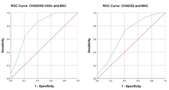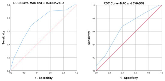 Area under the curve (ROC curve) analysis for mitral annular calcification (MAC) with CHA2DS2-VASC risk score (left) and with CHADS2 risk score (right).