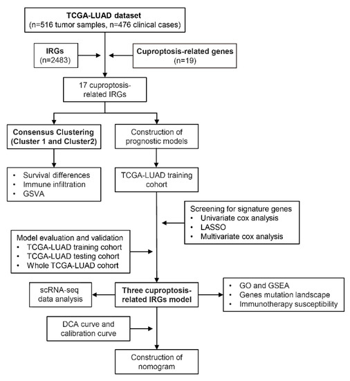 The flowchart of our study. A total of 516 lung adenocarcinoma (LUAD) samples from TCGA were included, and cuproptosis-related IRGs were identified. Tumor samples from TCGA-LUAD were then classified into two subtypes. Clinical prognostic features were constructed based on cuproptosis-related IRGs, and immunotherapy sensitivity analysis was performed.