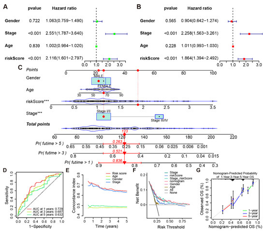 Establishment and performance evaluation of model. (A) Univariate and (B) multivariate Cox regression analysis of clinical features and risk scores. (C) Nomogram including of risk scores and clinical characteristics. (D) ROC curves for the precision of the model in predicting patient prognosis. (E) C-index curve based on the risk model. (F) Decision analysis of clinical features and risk scores to predict clinical benefit in LUAD patients. (G) Evaluation of nomogram’s 1-, 3-, and 5-year forecast accuracy. “***”: p < 0.001.